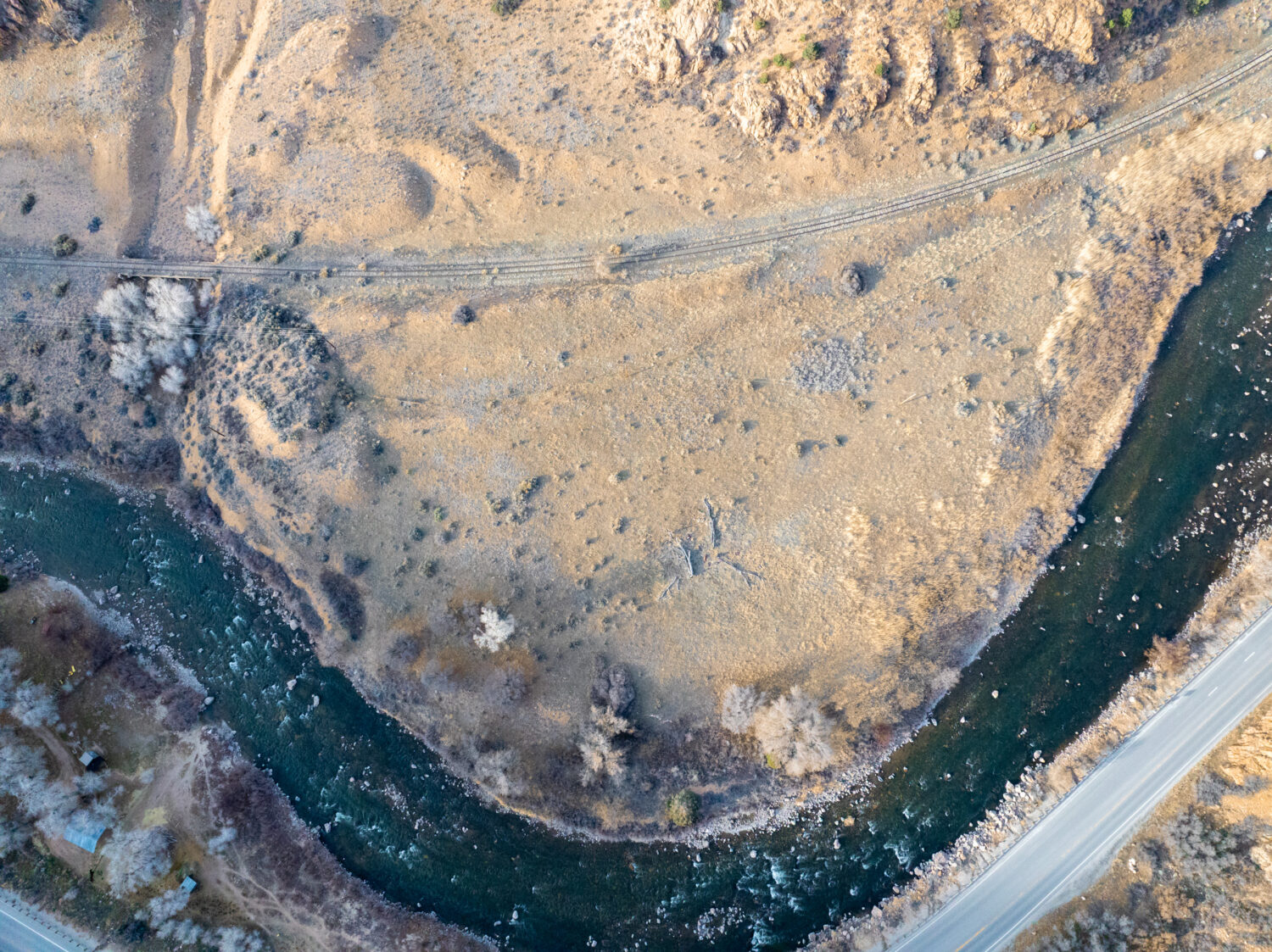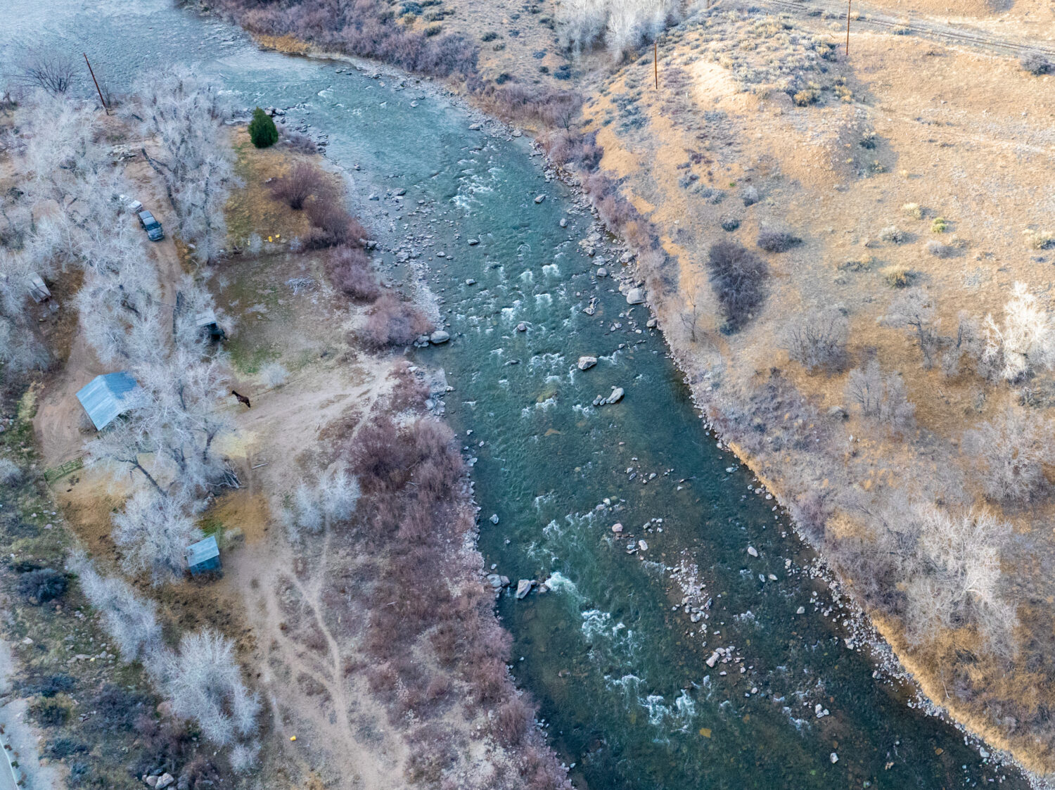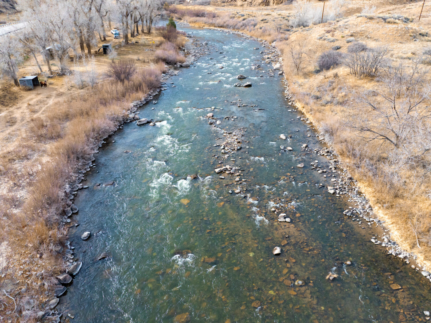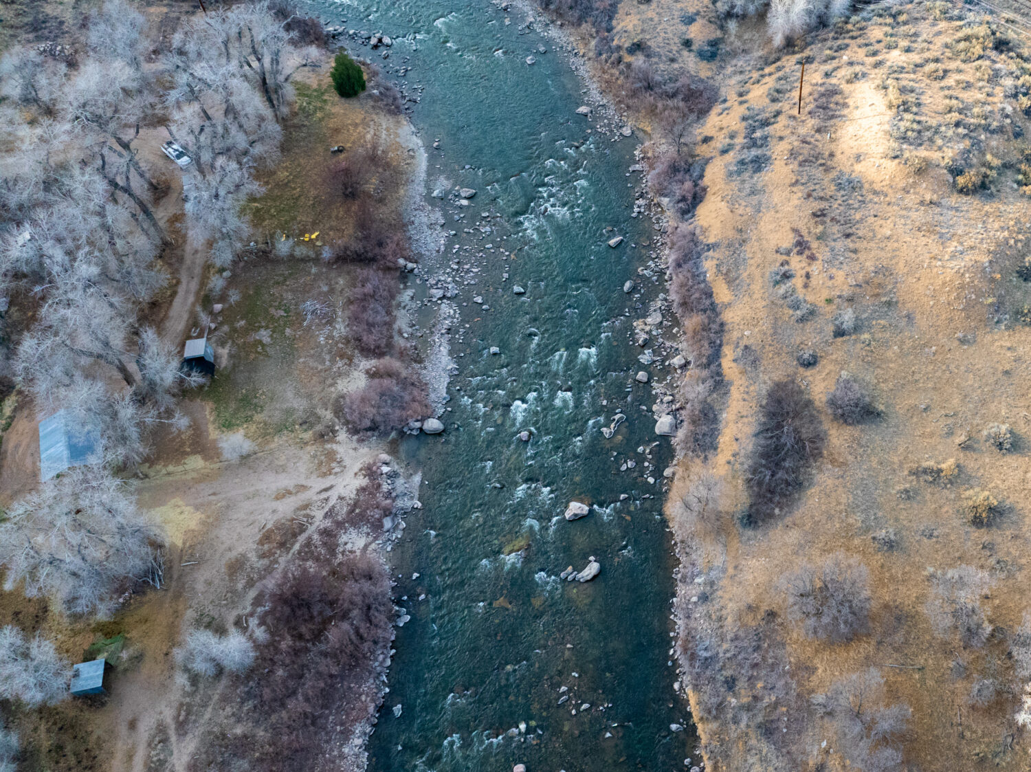 A utilitarian home, steel-framed shop, and productive well anchor the south. A loafing shed on the northern balance offers livestock or equipment storage. Power has been run to a camping area near the river, ideal for hosting guests or supporting a small outfitting operation. Ample space remains for additional structures.